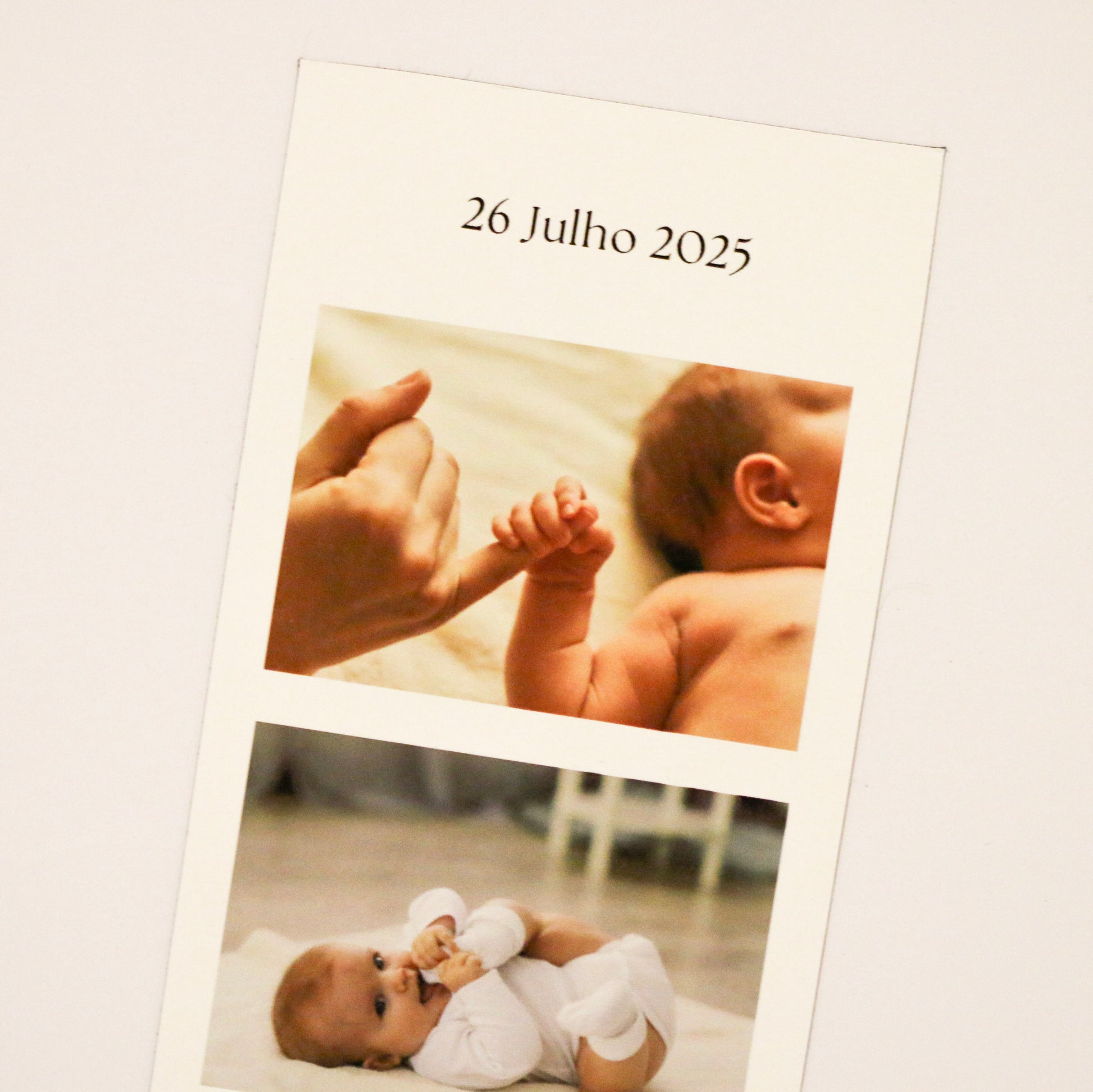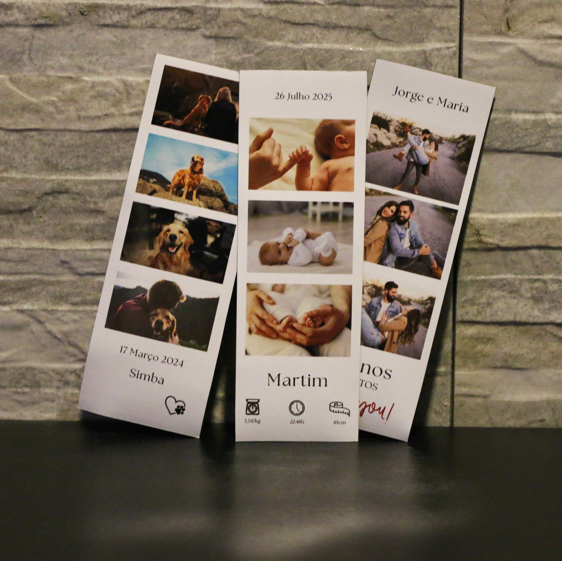 O photobooth personalizado permite reunir várias fotografias num único formato contínuo, criando uma narrativa visual de momentos especiais. Cada peça é produzida a partir das imagens fornecidas, resultando num produto único e pessoal.